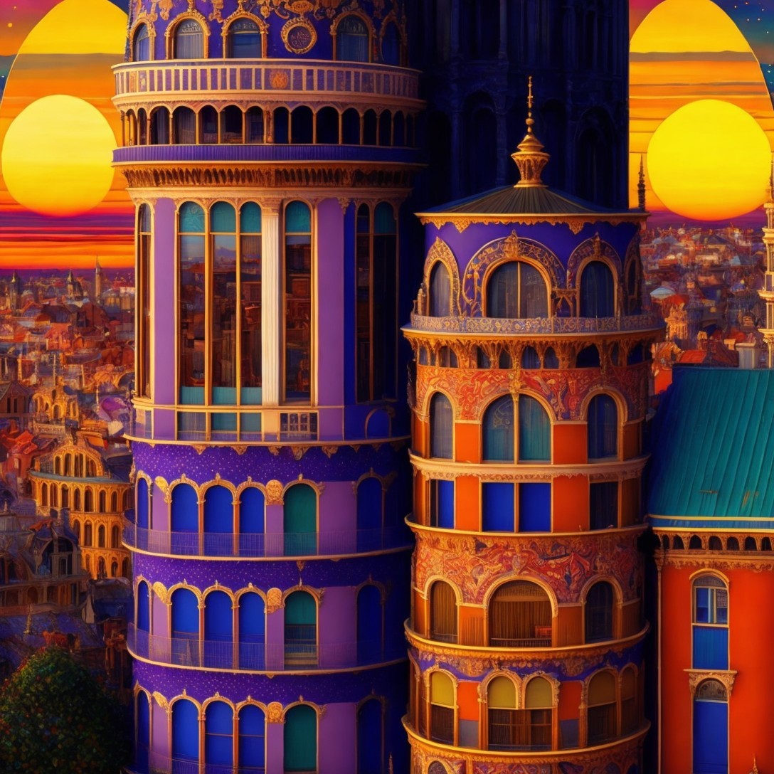 Prompt: Full page, single image, no people, high definition, beautiful Victorian city, patchwork, sunrise, with elements of Gustav Klimt style and Tingatinga style
