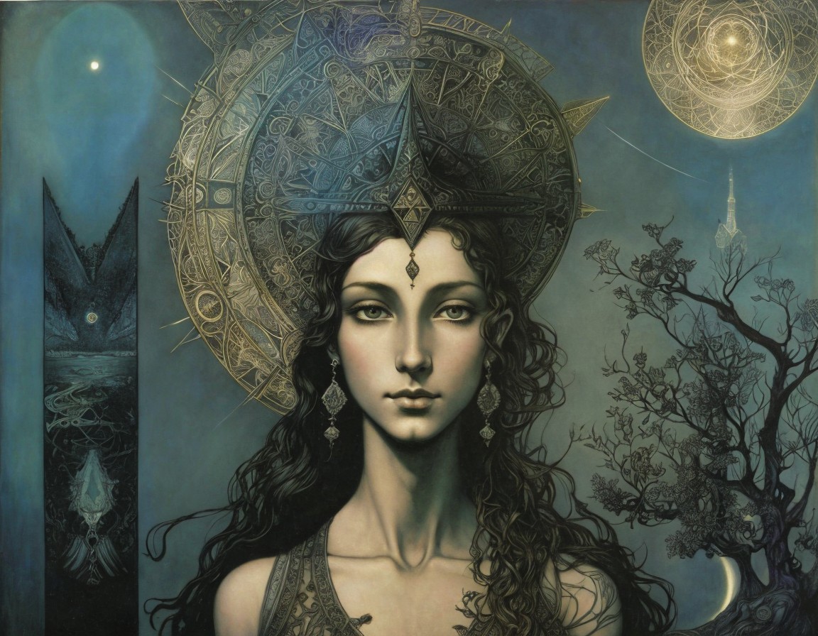 A captivating illustration features three ethereal women, each adorned with celestial motifs. They embody a blend of elegance and mystique, surrounded by intricate astronomical designs.