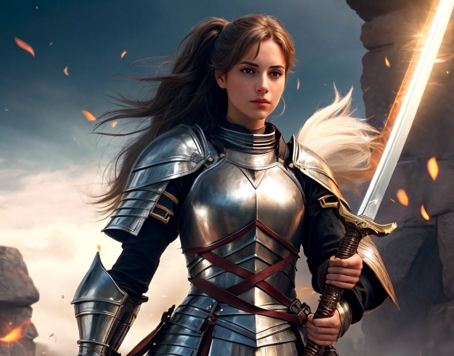 A determined warrior woman clad in shining armor holds a sword amidst a battlefield, with fiery embers floating around her.