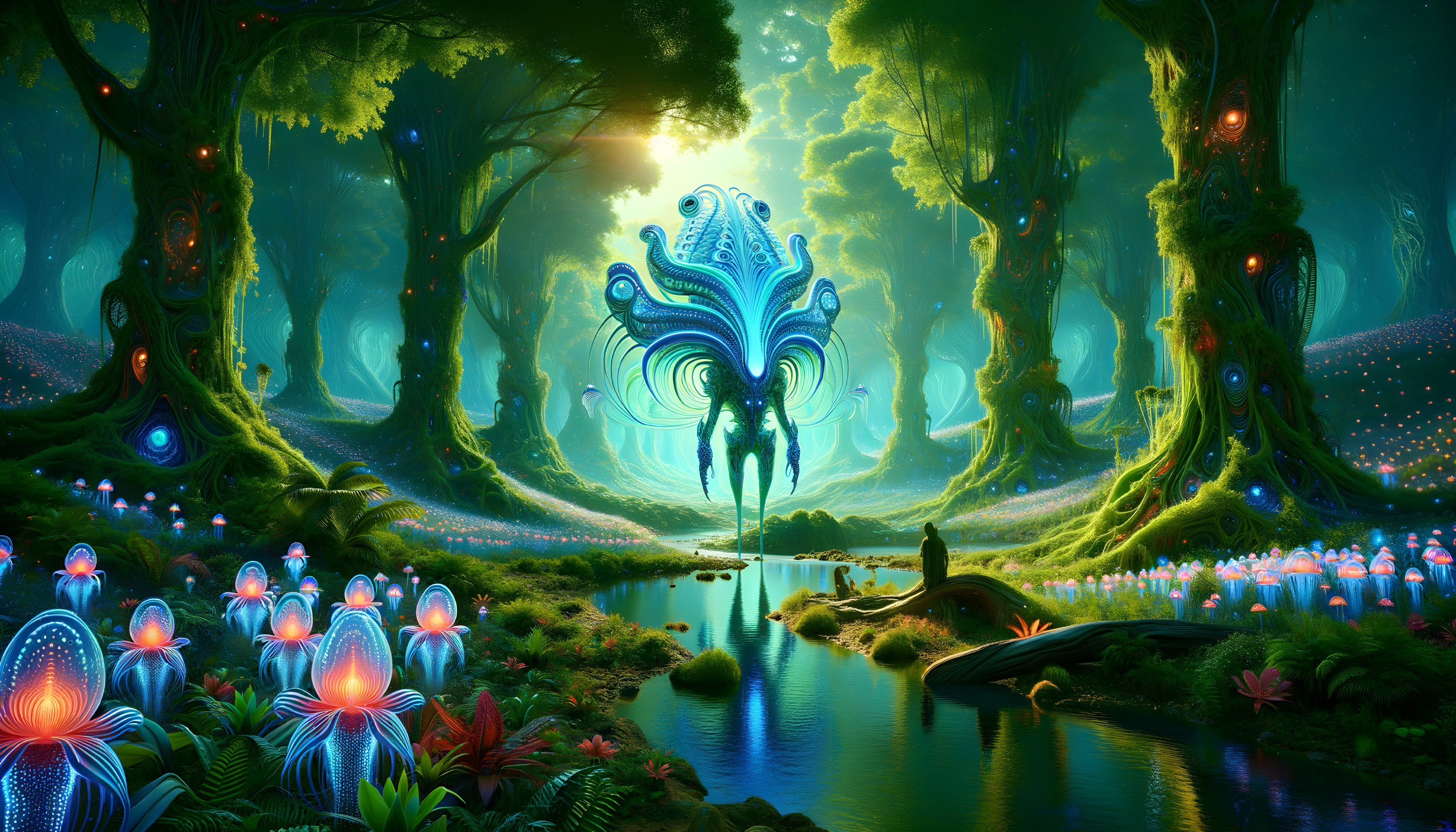 Luminous alien forest with surreal creature and celestial glow