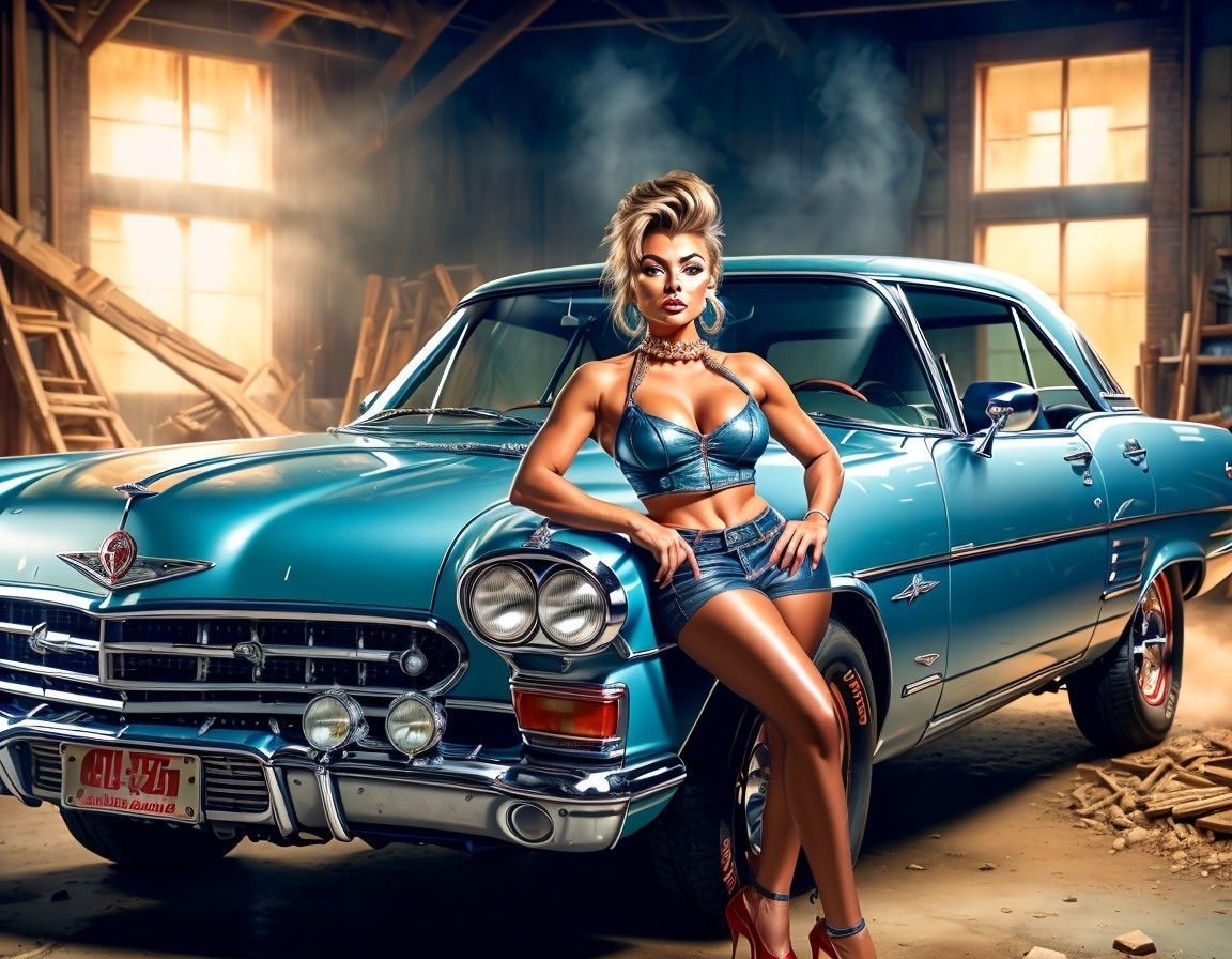 A stylish woman in a denim outfit poses confidently beside a classic turquoise car in a rustic setting, exuding a vintage vibe with soft lighting and an air of glamour.