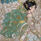 A beautiful woman in a flowing kimono adorned with intricate patterns, surrounded by vibrant flowers. Her long, wavy hair cascades elegantly, blending harmoniously with the floral backdrop.
