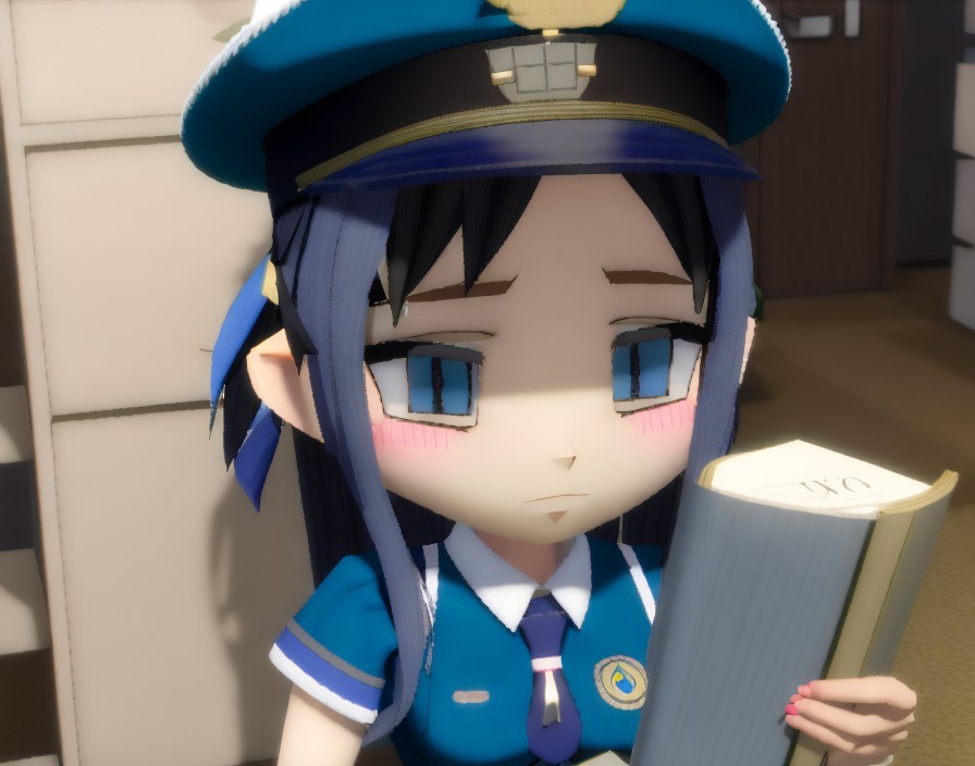 A close-up of an animated character with blue eyes and a police cap, holding a ticket, with buildings in the background.