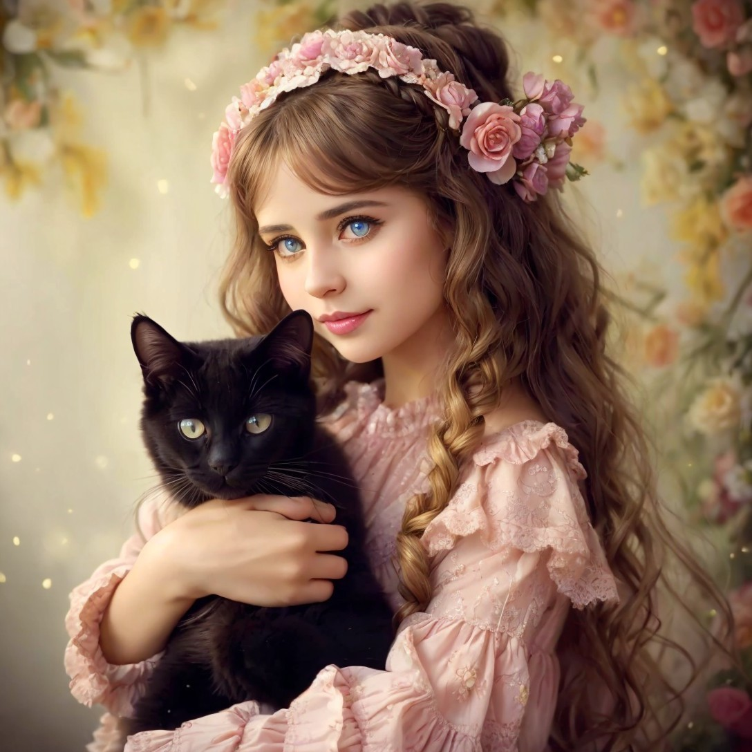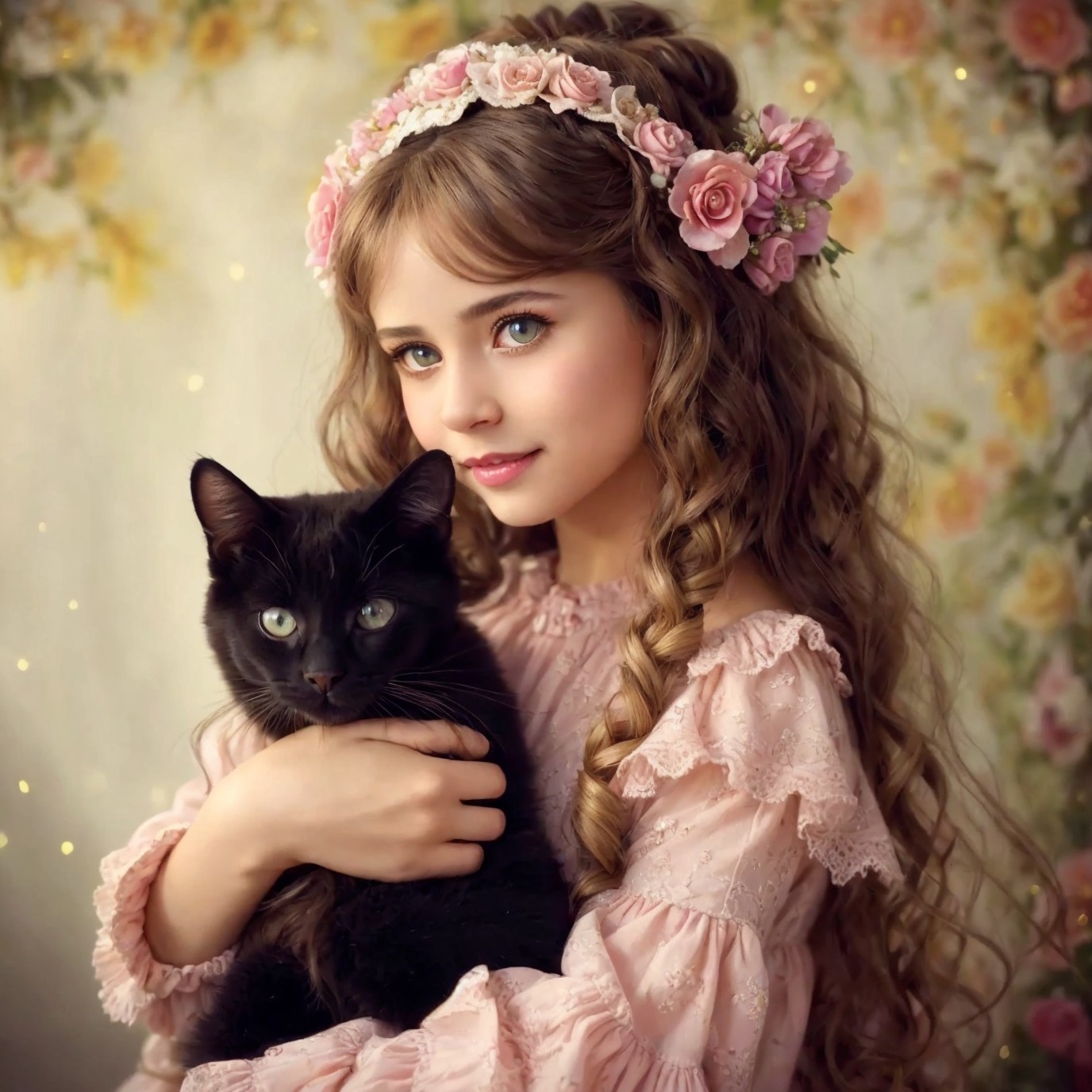 A young girl with long, wavy hair adorned with flowers holds a black cat close to her chest. She wears a soft pink dress, surrounded by a floral background that adds a whimsical touch.