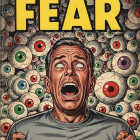 The image features a vintage comic book cover titled "Worlds of Fear," depicting a terrified man with bulging eyes surrounded by numerous surreal, large eyeballs in a colorful arrangement.