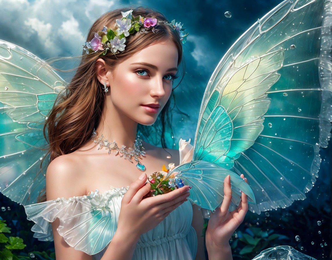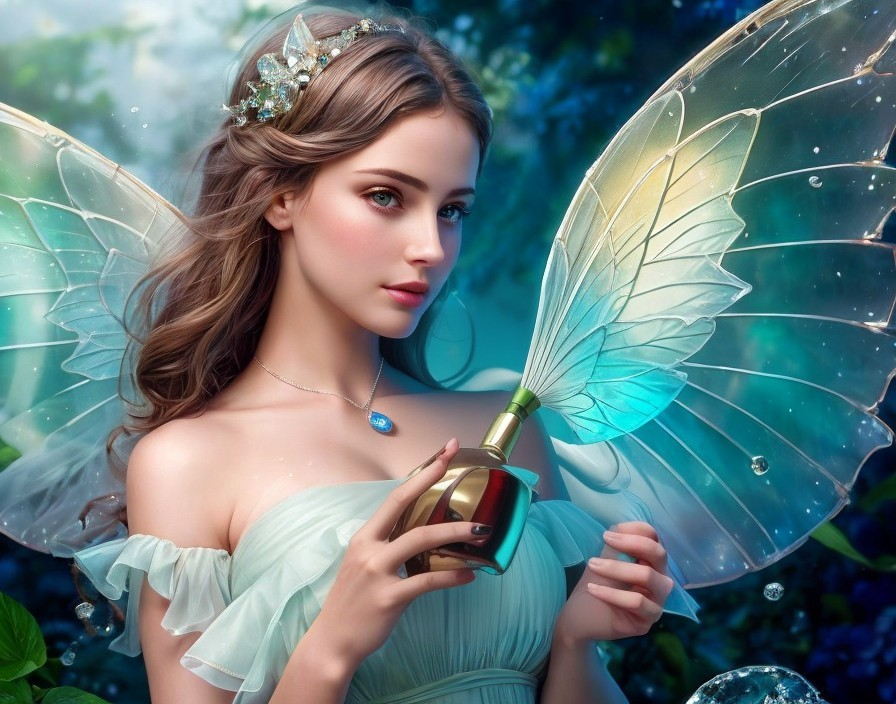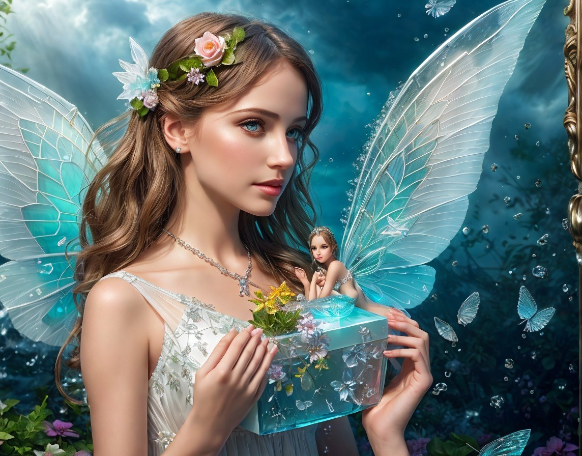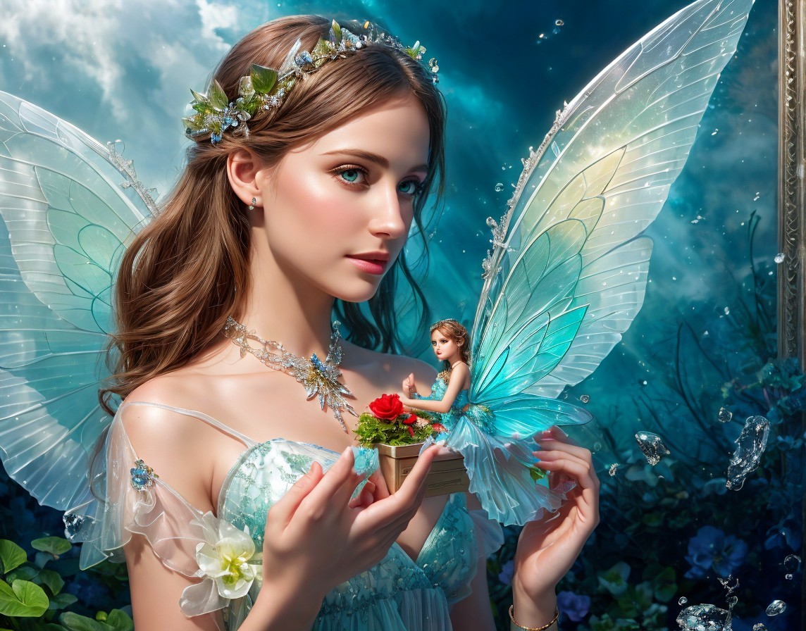 A fantastical image of two fairies with translucent wings amidst a floral, bubble-filled environment, the larger one holding flowers.