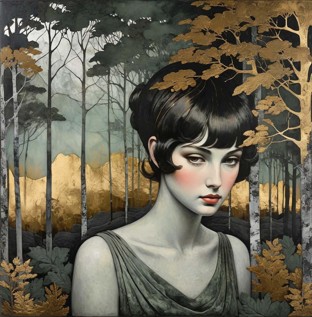 A serene portrait of a woman with sleek black hair, set against a moody forest backdrop of gold and green foliage, exuding a blend of elegance and mystery.