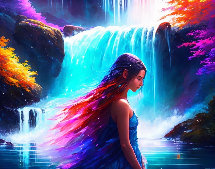 Digital Artwork: Woman with Flowing Hair in Enchanted Autumn Forest
