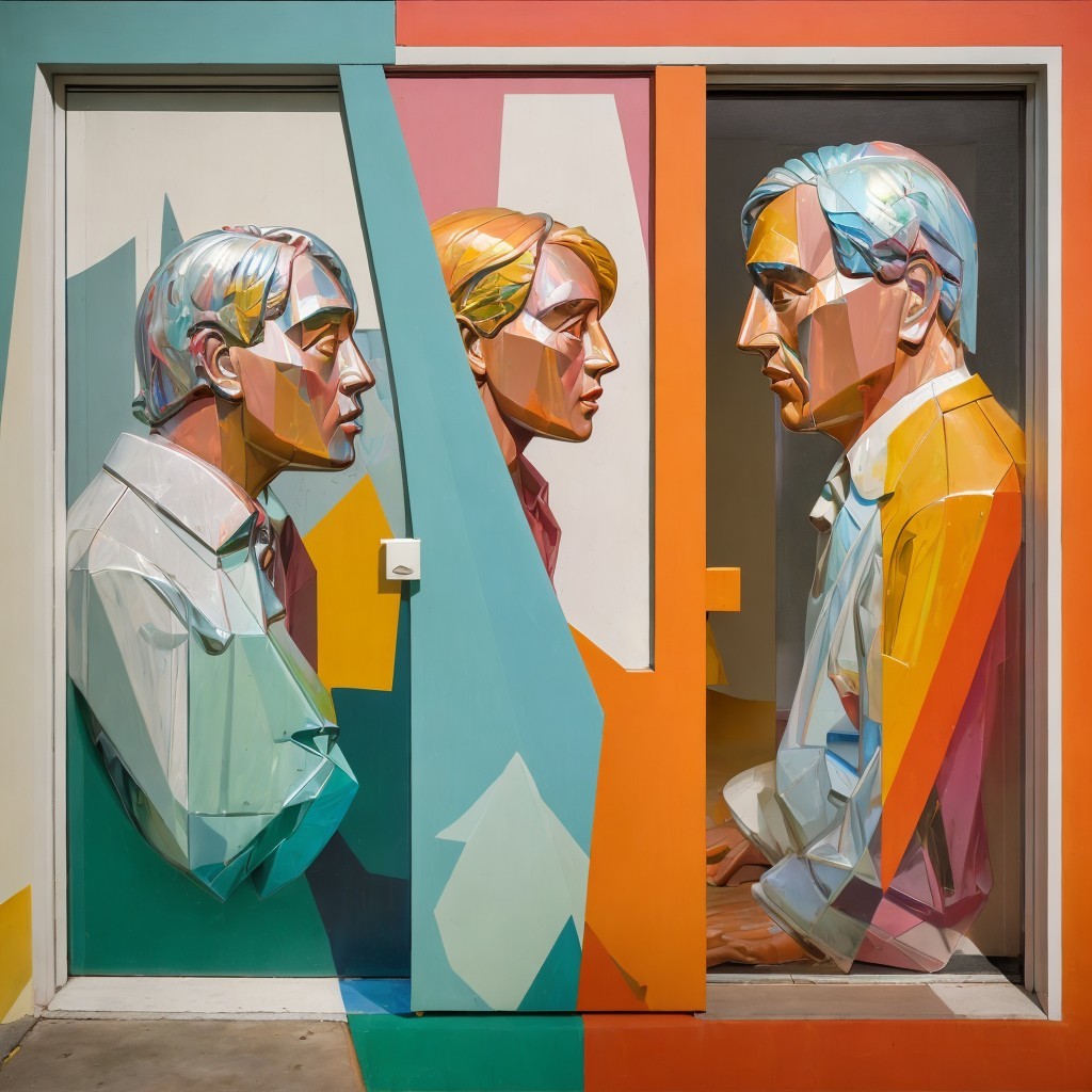 A cubist-style painting depicting three perspectives of a person's head in profile against colorful geometric backgrounds.
