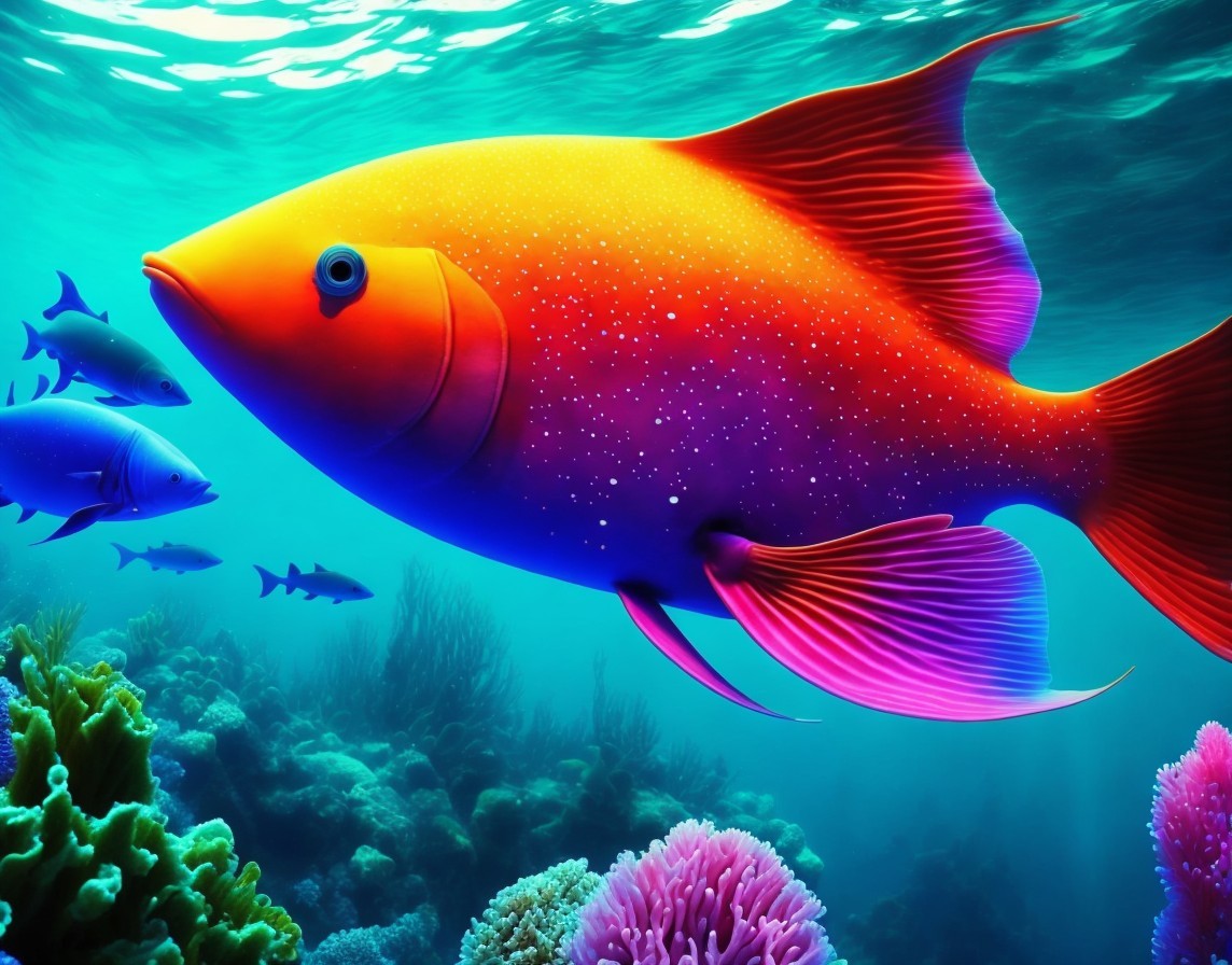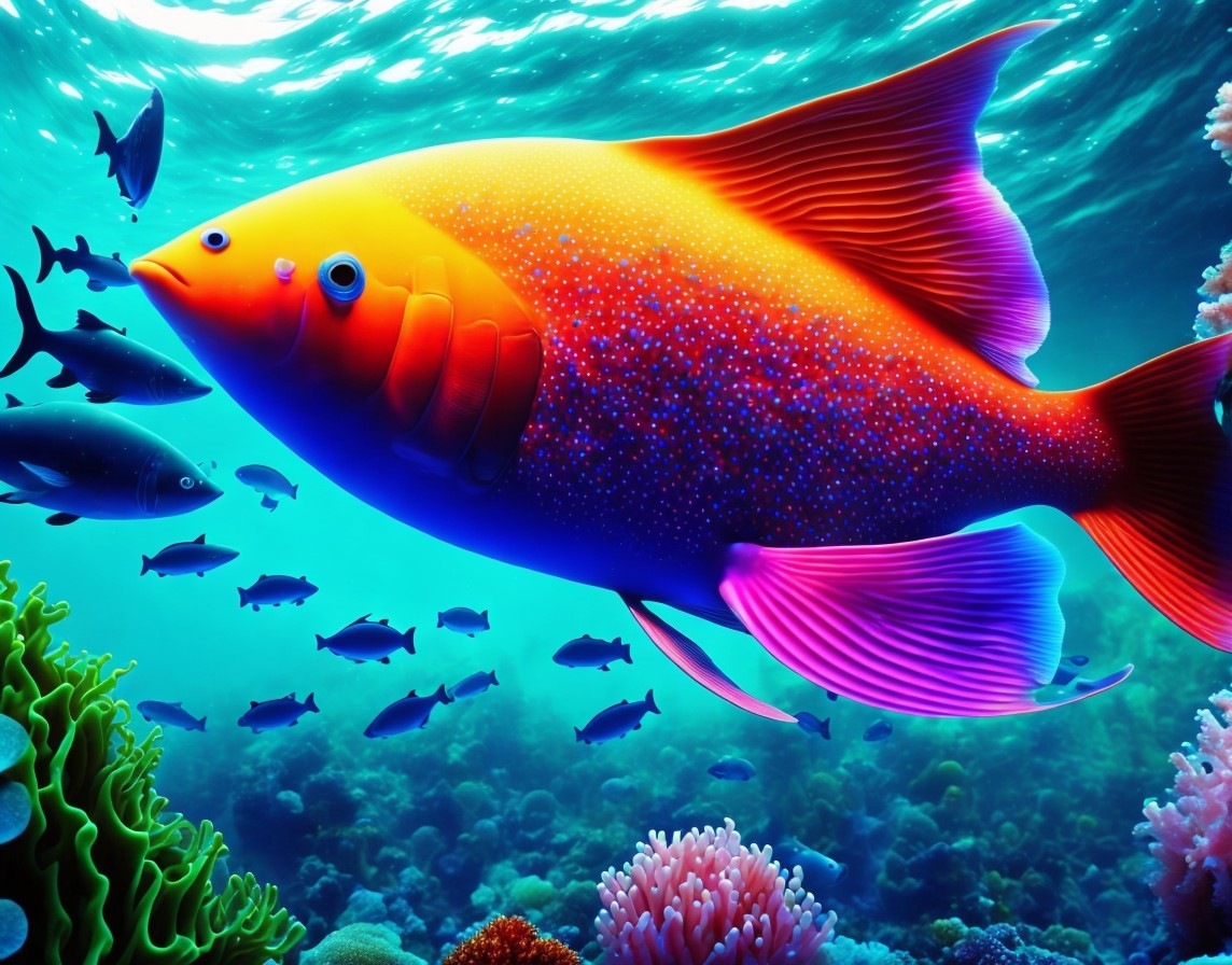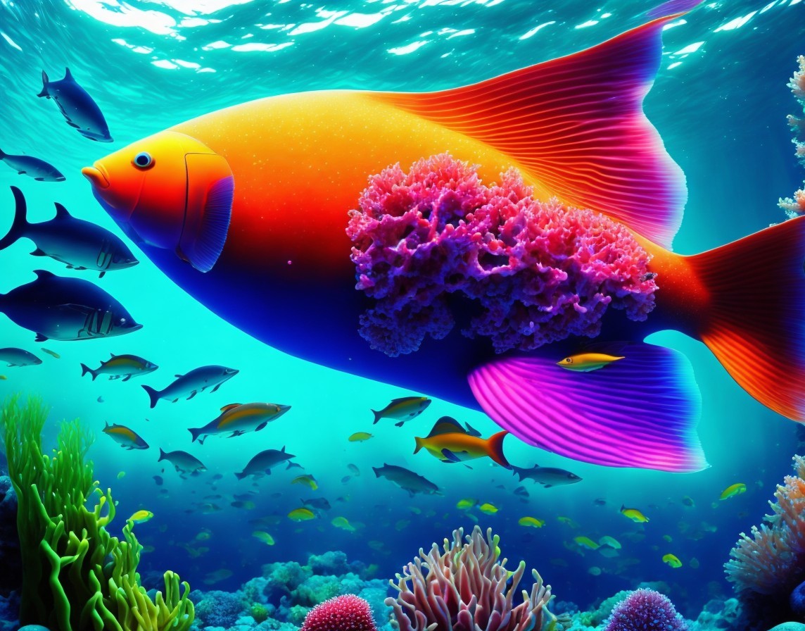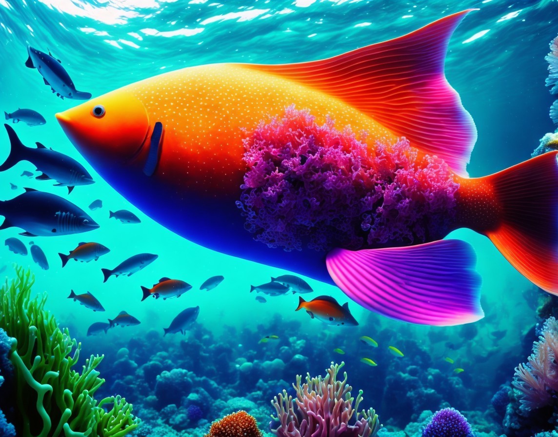 Colorful underwater illustration: Large orange fish with pink coral among smaller fish in vibrant coral reef