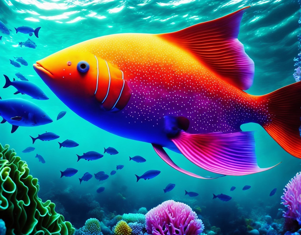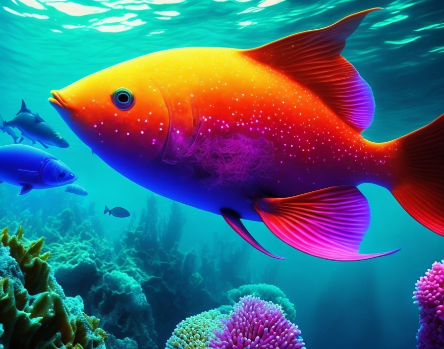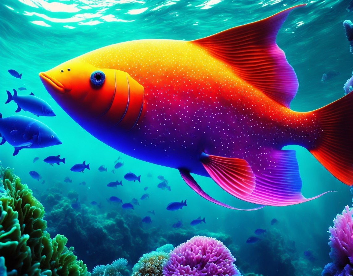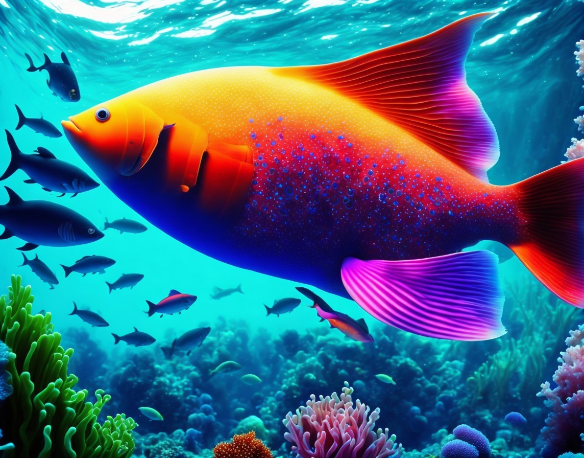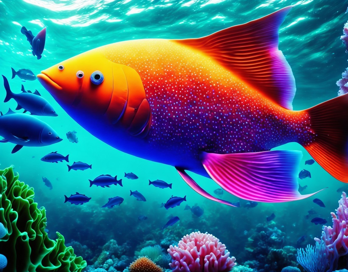 Colorful underwater illustration: Large orange fish with pink coral among smaller fish in vibrant coral reef