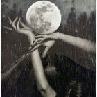 A woman with flowing hair stands under a luminous full moon, rain cascading around her. She gazes upward, embodying joy and serenity, dressed in a shimmering silver outfit that reflects the moonlight.