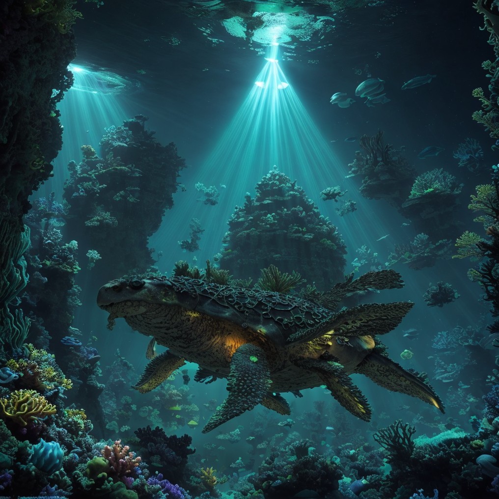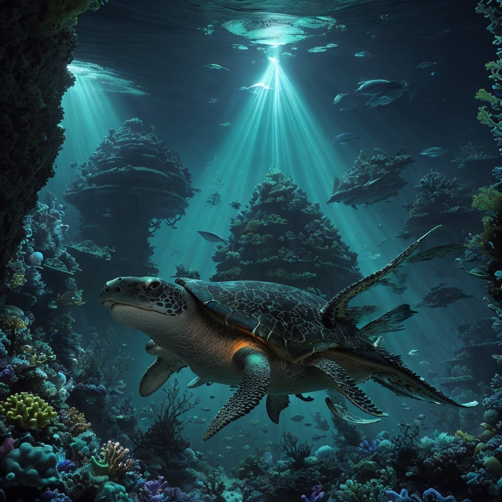 An underwater scene with a sea turtle, diverse fish, and a sunlit coral reef portraying a serene aquatic landscape.