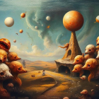 A surreal landscape features a towering structure resembling a mountain, surrounded by eerie, mask-like faces. Celestial bodies float in a dreamlike sky, enhancing the fantastical atmosphere.