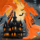 A spooky, whimsical haunted house stands silhouetted against a dramatic sky filled with swirling orange and dark clouds. Bats soar around, while eerie yellow lights glow from the windows.