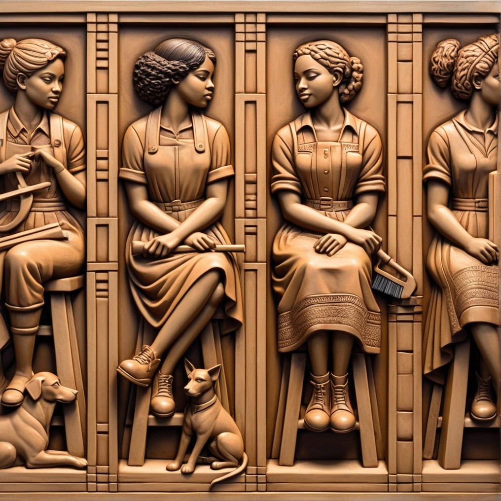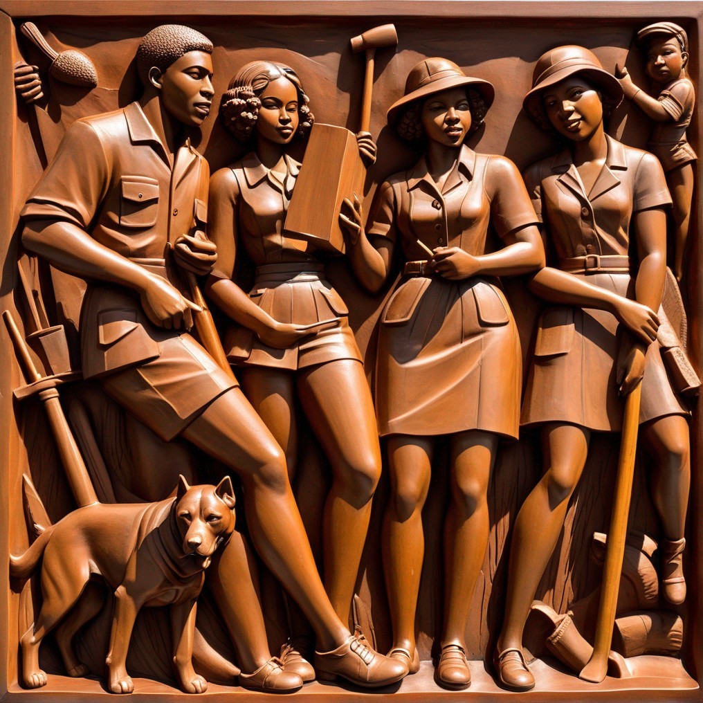 A bas-relief sculpture depicts five women in uniform, a moment of solidarity and commemoration.