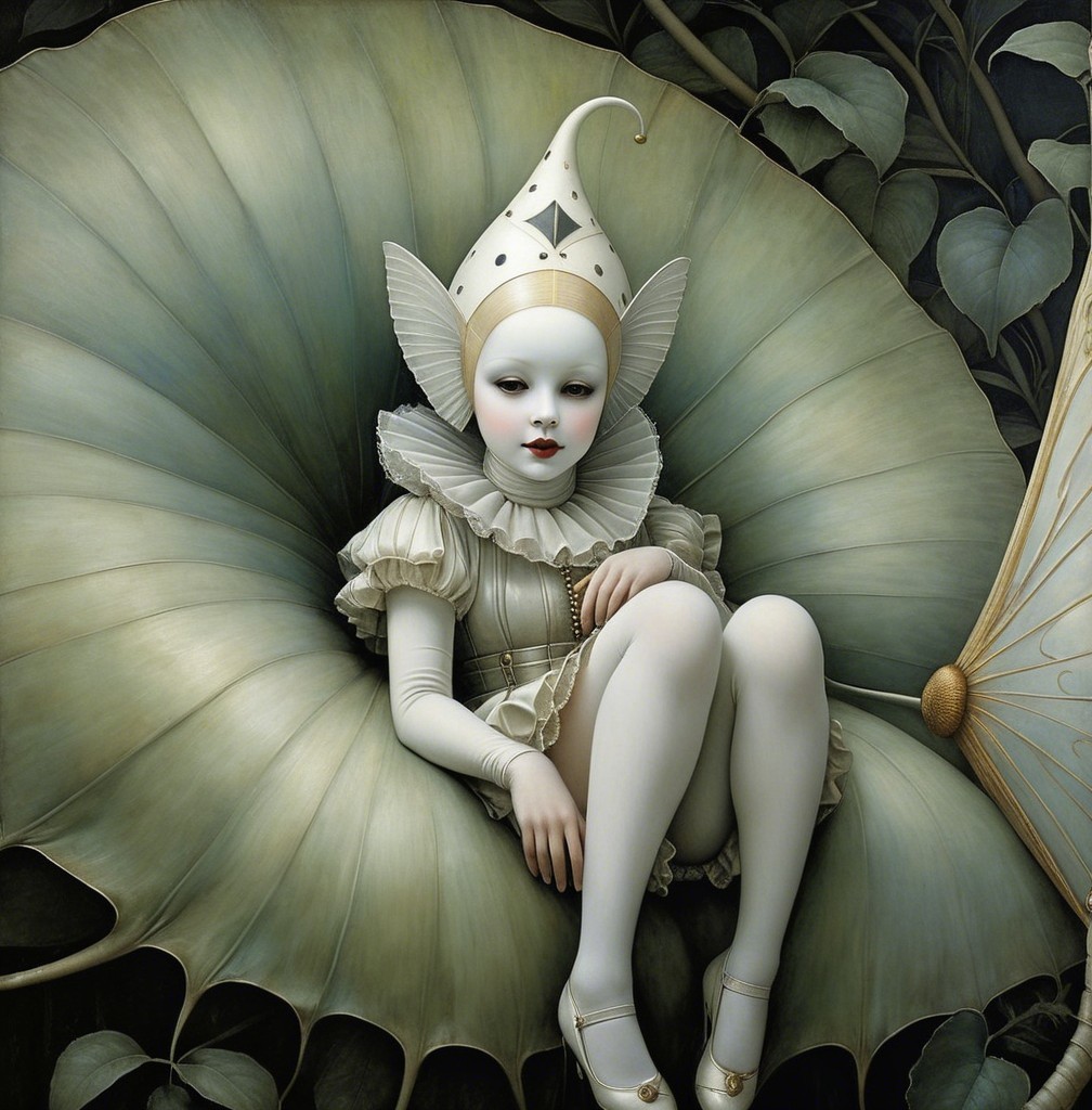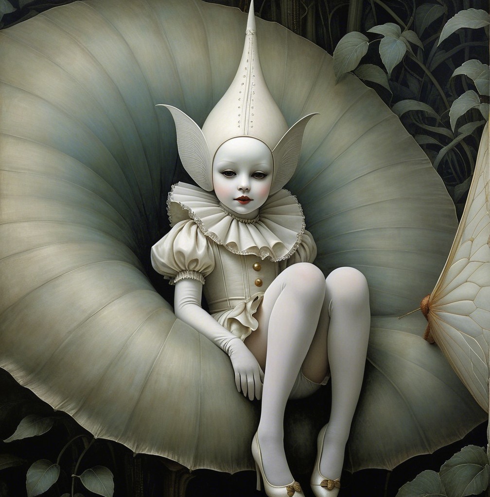 A porcelain-like figure in a whimsical attire sits gracefully inside a large, spiraled shell. The character features a dotted conical hat, ruffled collar, and an enchanting, surreal atmosphere.