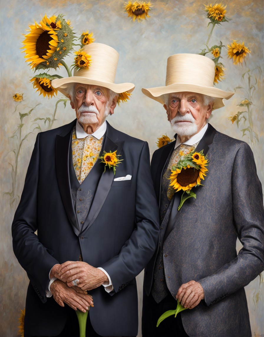 Elderly gentlemen in suits and straw hats with sunflowers on warm-toned backdrop