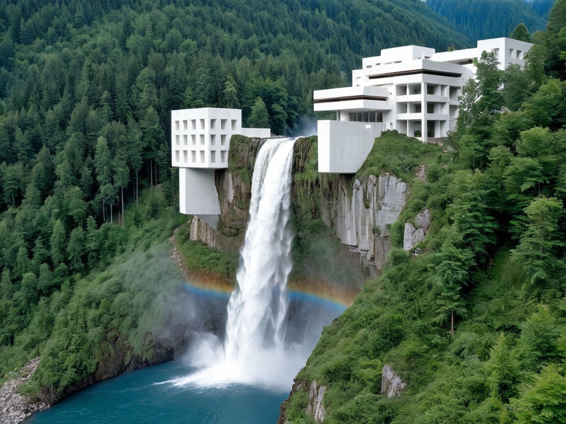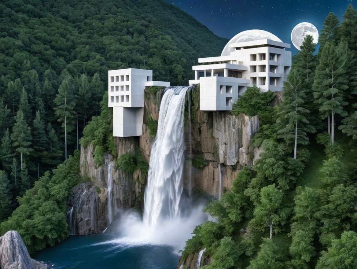 A surreal landscape features modern, concrete structures perched atop a cliff, with a waterfall cascading down into a serene pool, set against a starry night sky with two moons.