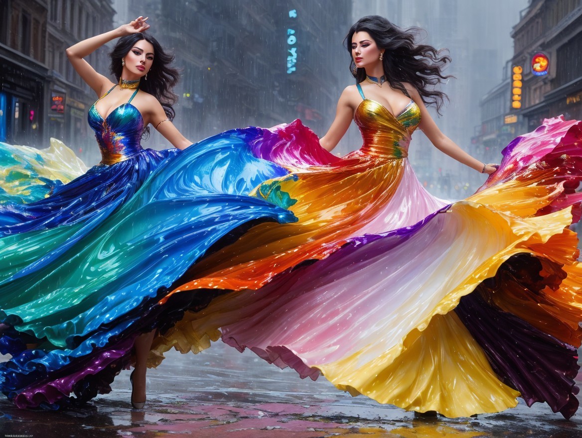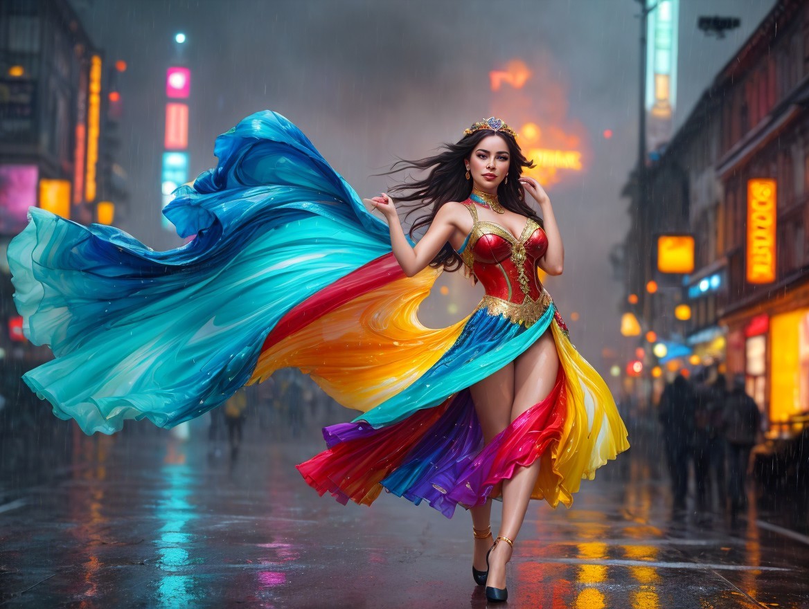 A stunning dancer in a colorful, flowing outfit strikes a dynamic pose, with vibrant fabric swirling around her against a misty, urban backdrop, evoking a sense of celebration and energy.