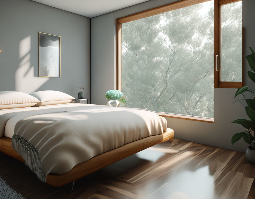 Prompt: Modern contemporary bedroom on upper floor. The walls are glossy grey. There is dark flooring. There is a King sized platform bed. There is ambient lighting in the room. Romantic atmosphere. Remove lower light hanging from ceiling
