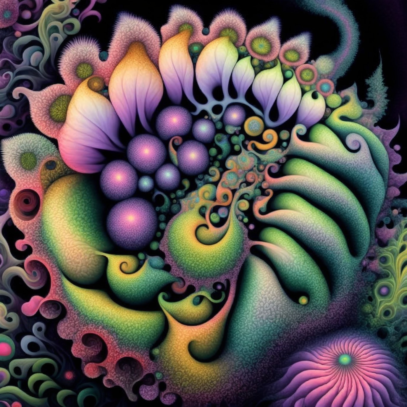 A vivid fractal image with swirling patterns, floral motifs, and gradient textures in a mesmerizing, colorful design.