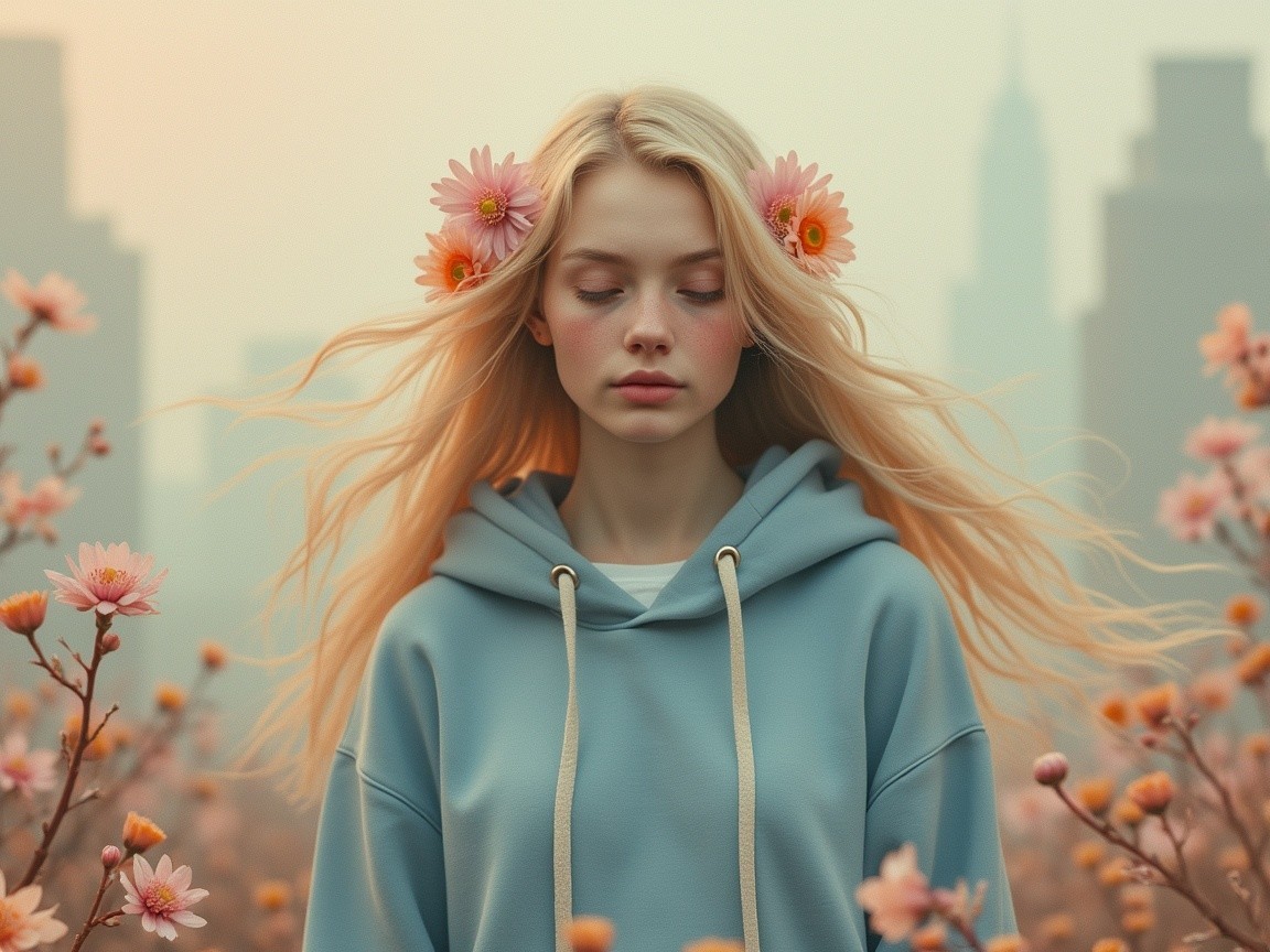 A serene young woman stands amidst blooming flowers, wearing a blue hoodie. Her long blonde hair flows gently, adorned with floral accents, against a soft city skyline backdrop.