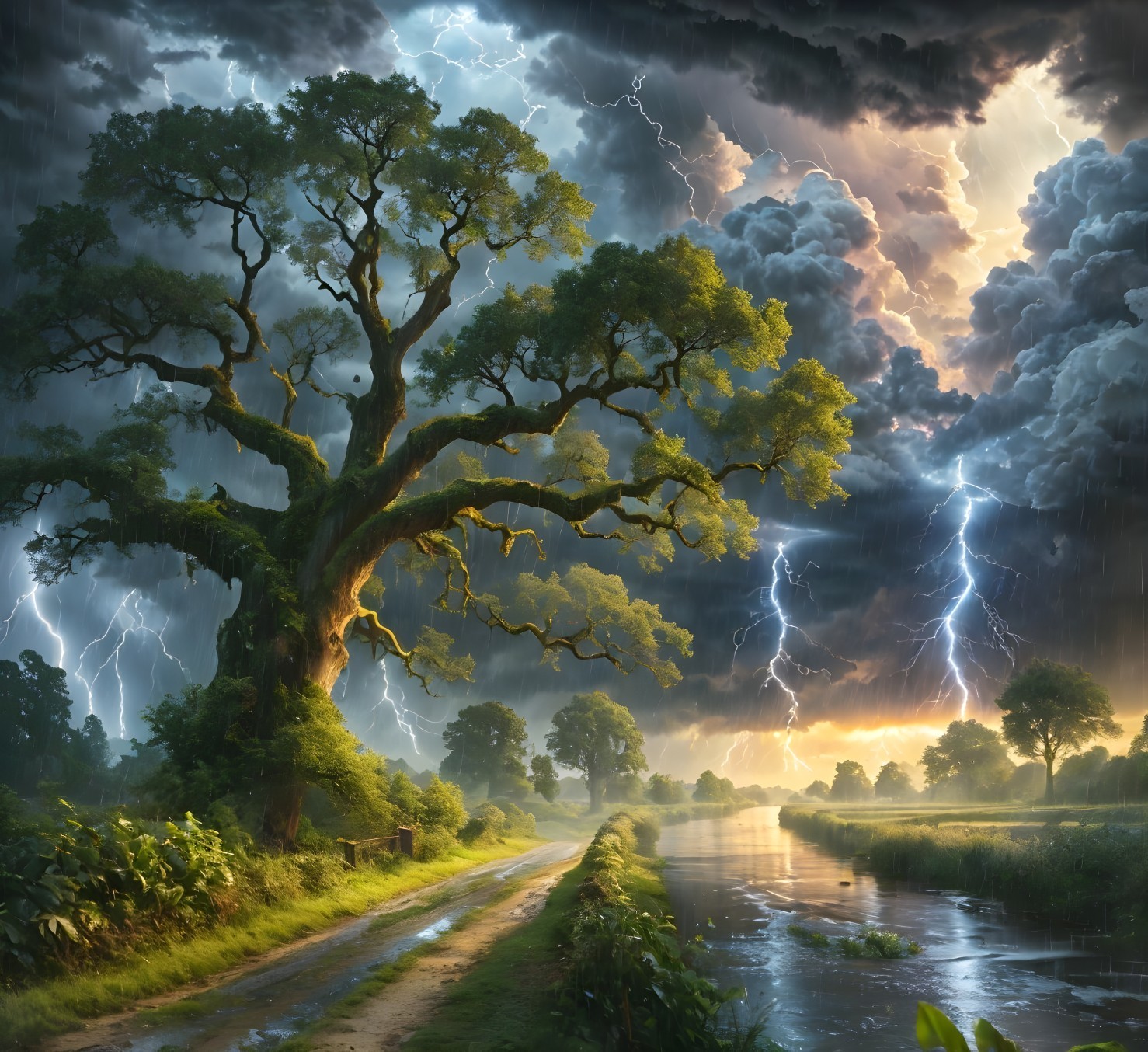 A majestic tree stands by a path as lightning strikes illuminate a tumultuous sky, reflecting off a serene river amidst a brewing storm.