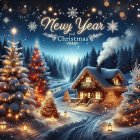 A cozy, snow-covered cabin nestled among tall pine trees, adorned with colorful lights. The night sky sparkles with stars and snowflakes, celebrating the spirit of New Year and Christmas.