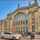 A bustling historical train station with grand architecture, featuring ornate sculptures atop its façade. Classic cars line the street, while crowds of people move through the vibrant scene.