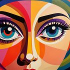 A vibrant, abstract portrait featuring a close-up of a face with striking, colorful eyes. The bold geometric patterns and vivid hues create a captivating, surreal aesthetic.