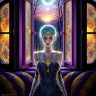 A serene scene unfolds through an open door, revealing a majestic white deer amidst vibrant flowers and lush foliage, with mountains and a colorful sunset reflecting in tranquil waters.