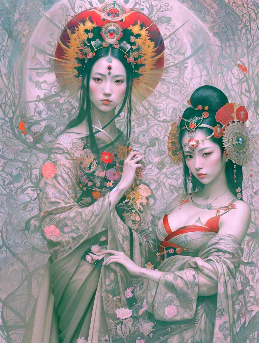 Two women in traditional ornate headpieces and clothing with intricate floral patterns amidst a similarly patterned backdrop.