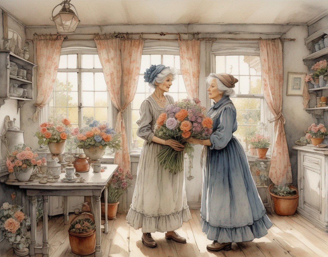 Two elderly women share a moment, exchanging flowers in a quaint, sunlit room filled with plants and vintage decor.