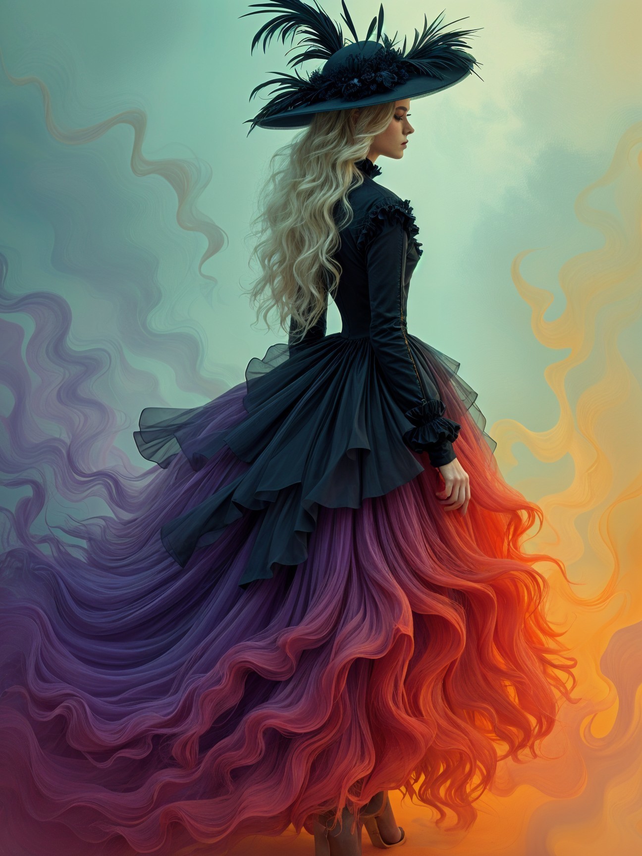 A woman in a dramatic, layered gown with shades of black and fiery orange stands elegantly. She wears a wide-brimmed hat adorned with feathers and flowers, set against a vibrant, swirling backdrop.