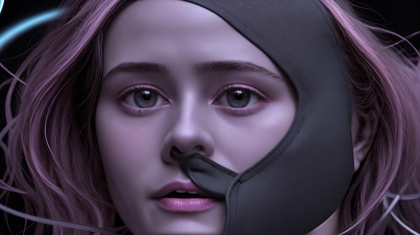 The image features a striking split-face portrait, combining a realistic human face with a stylized, blue-tinted mask. The contrast highlights emotions and identity in a captivating way.