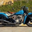 A classic 1951 Harley David-Davidson HL Knucklehead motorcycle shines in vibrant blue and purple hues, featuring a retro design with a sleek body, leather seat, and chrome details, set against a green backdrop of trees.