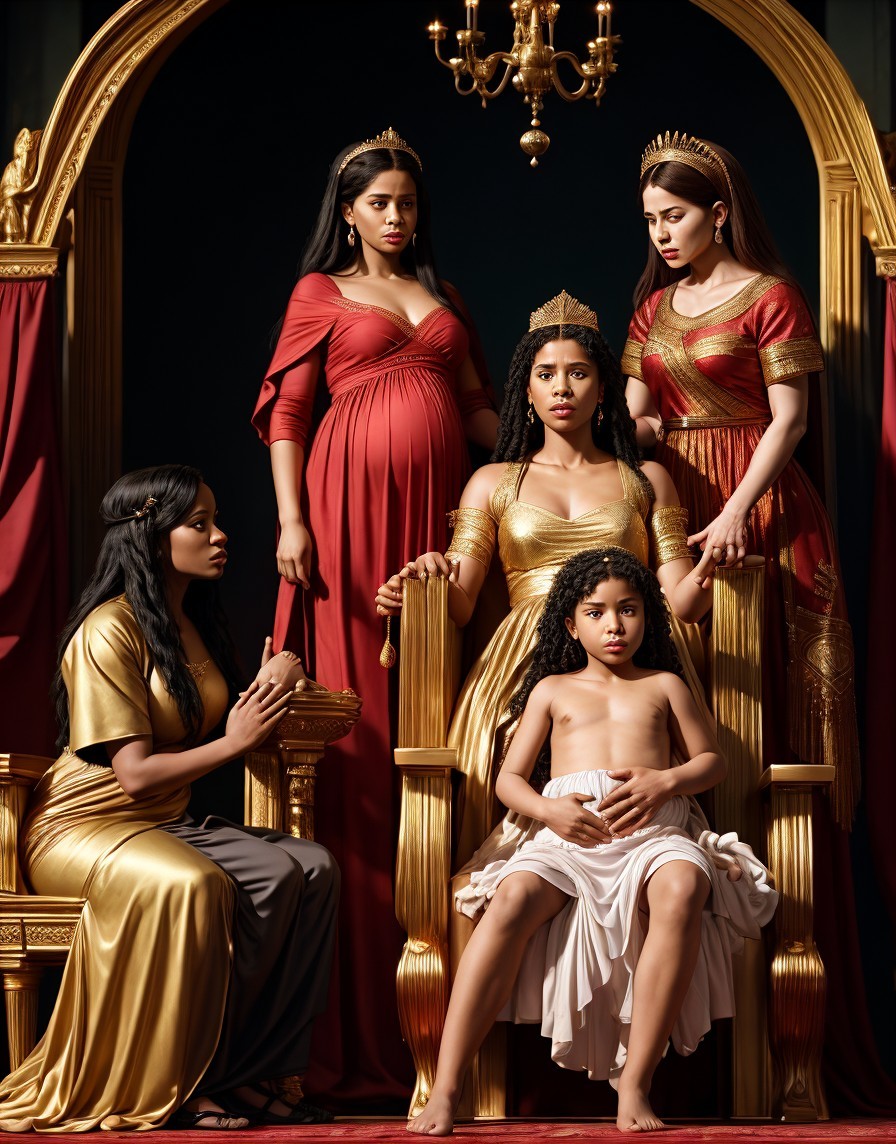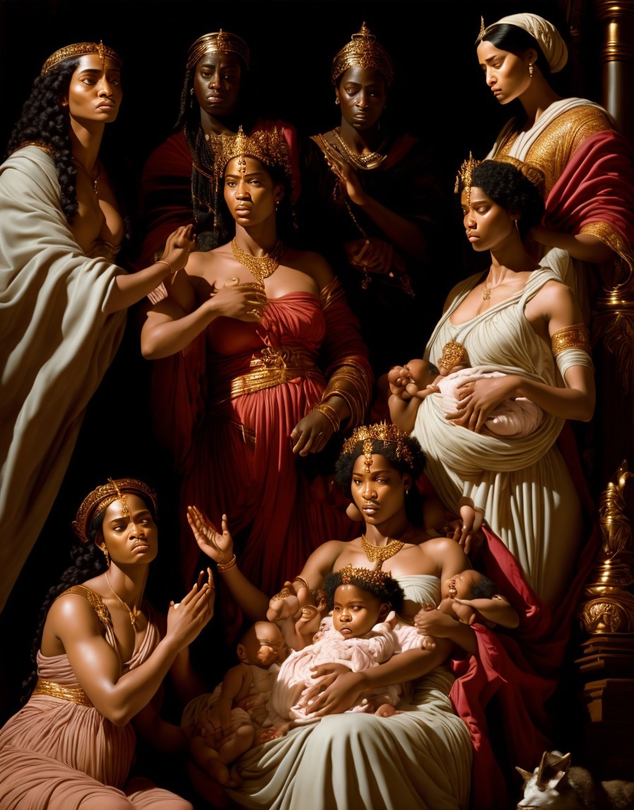 A classical painting depicting seven women in flowing robes, with dramatic poses and expressions, against a dark background with columns.