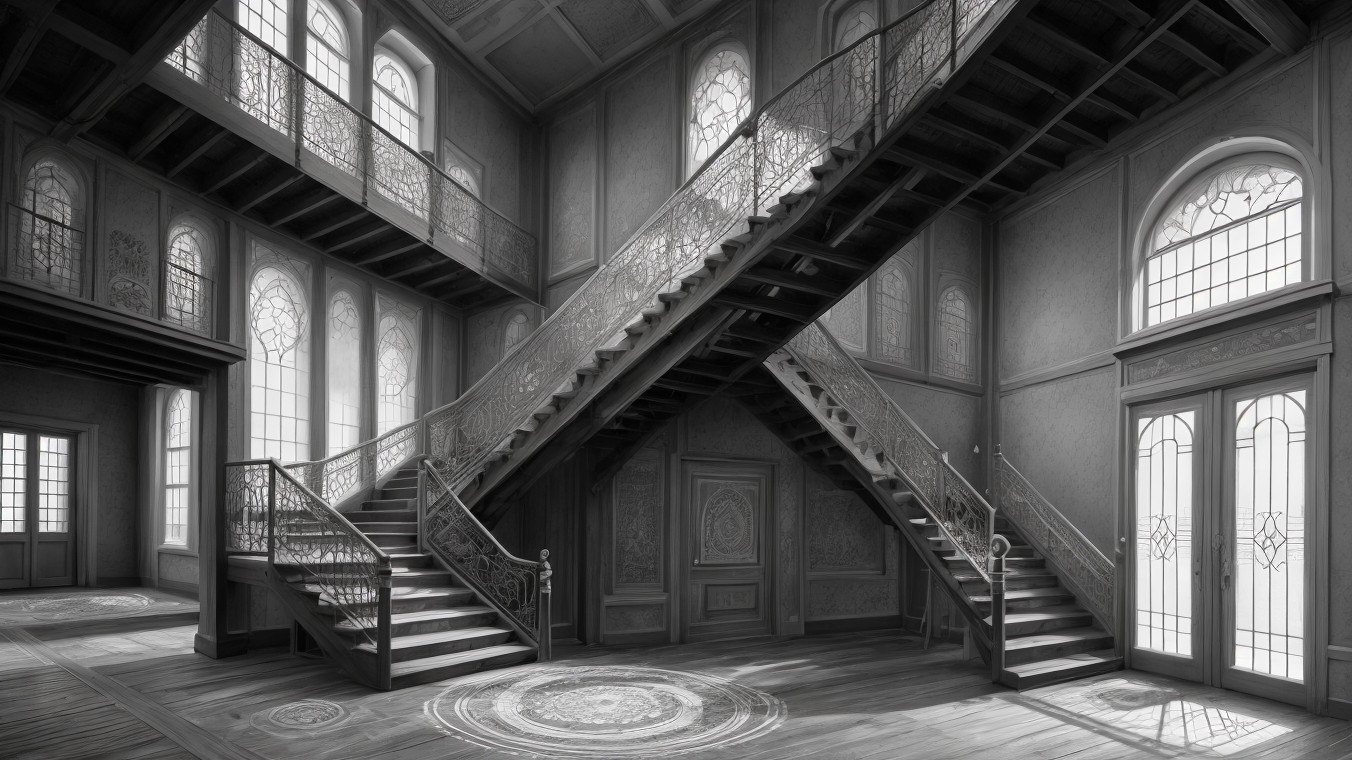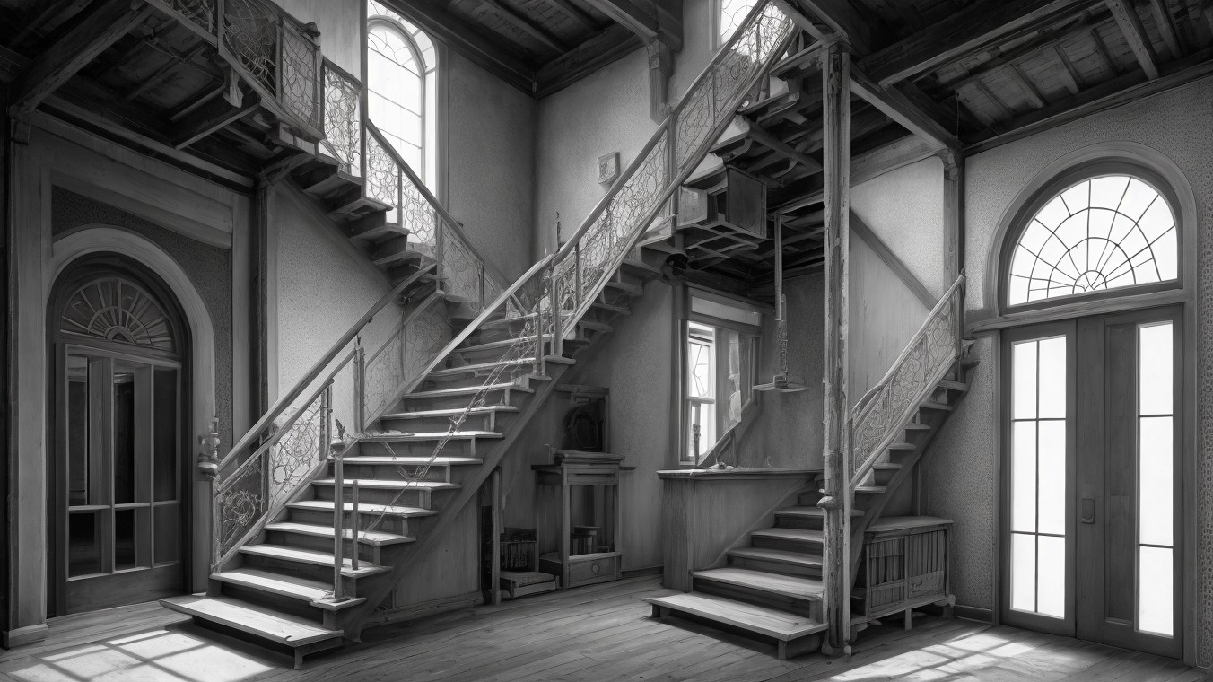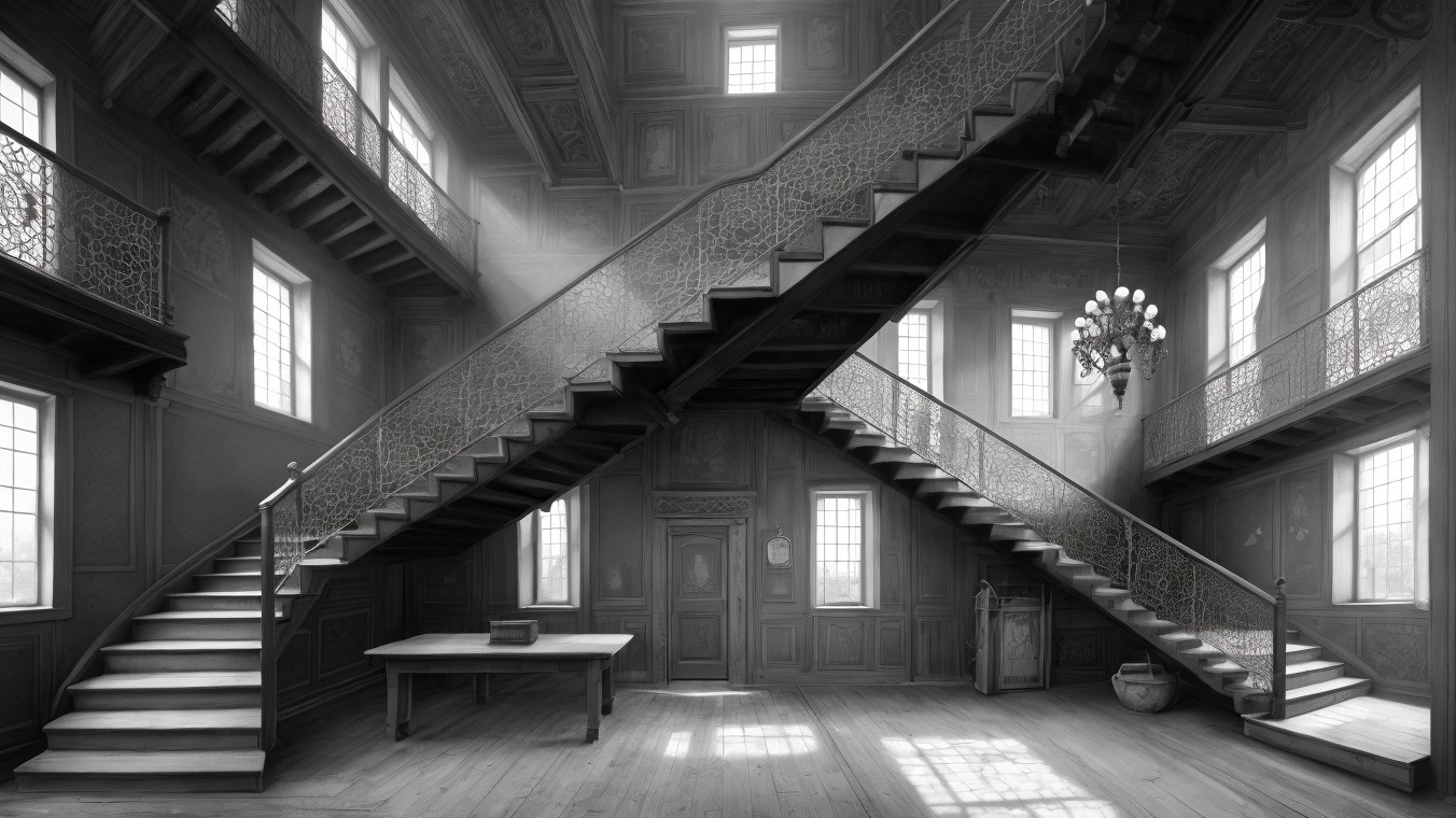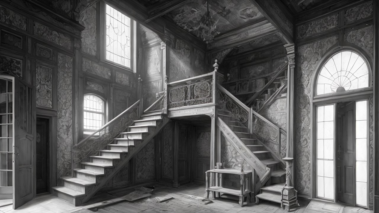 A dimly lit, abandoned interior featuring an elaborate wooden staircase with intricate railings. Dust motes float in the air, illuminating a sparse table and an ornate chandelier overhead.
