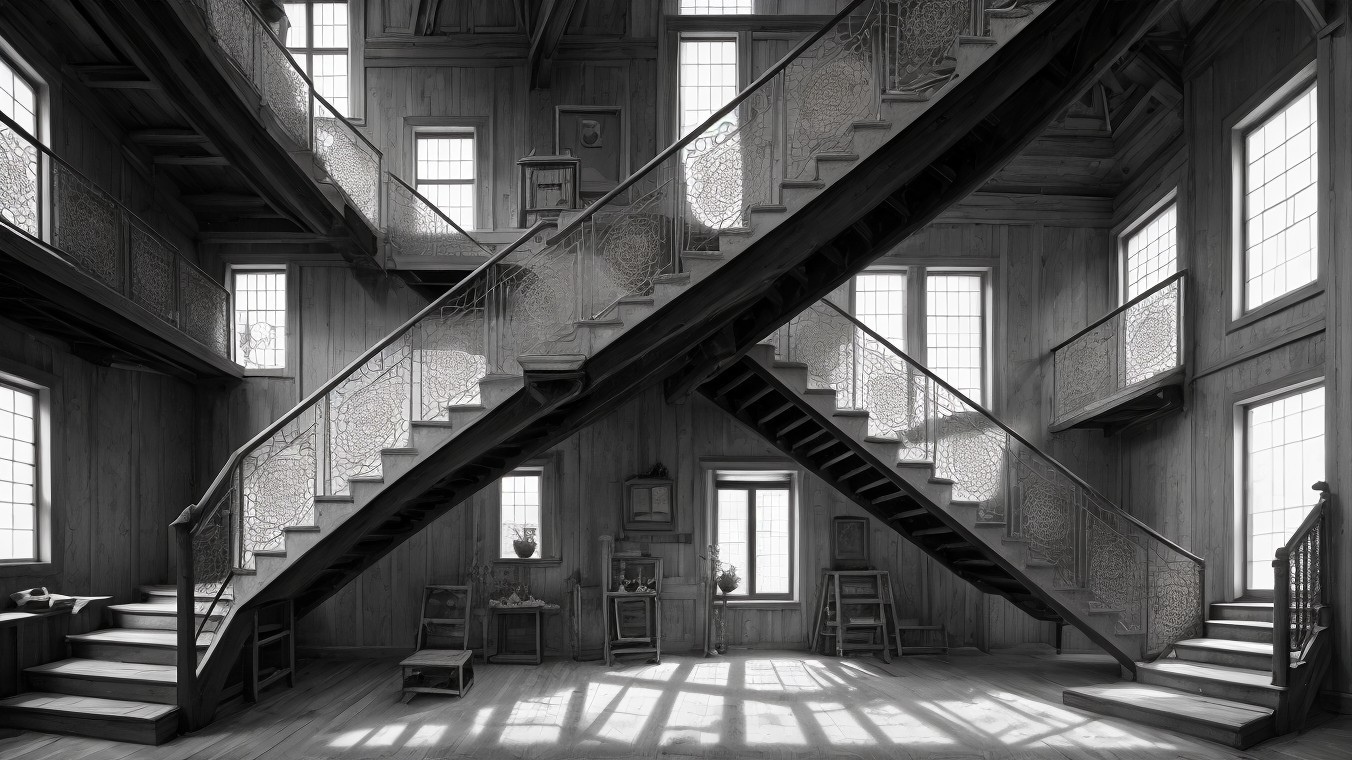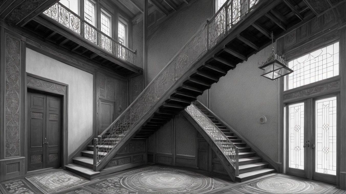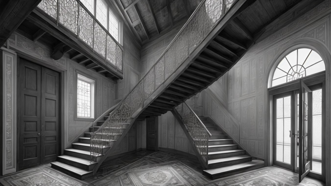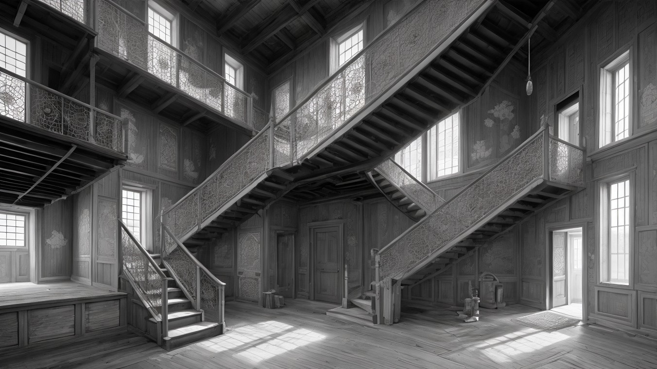 A dimly lit, abandoned interior featuring an elaborate wooden staircase with intricate railings. Dust motes float in the air, illuminating a sparse table and an ornate chandelier overhead.