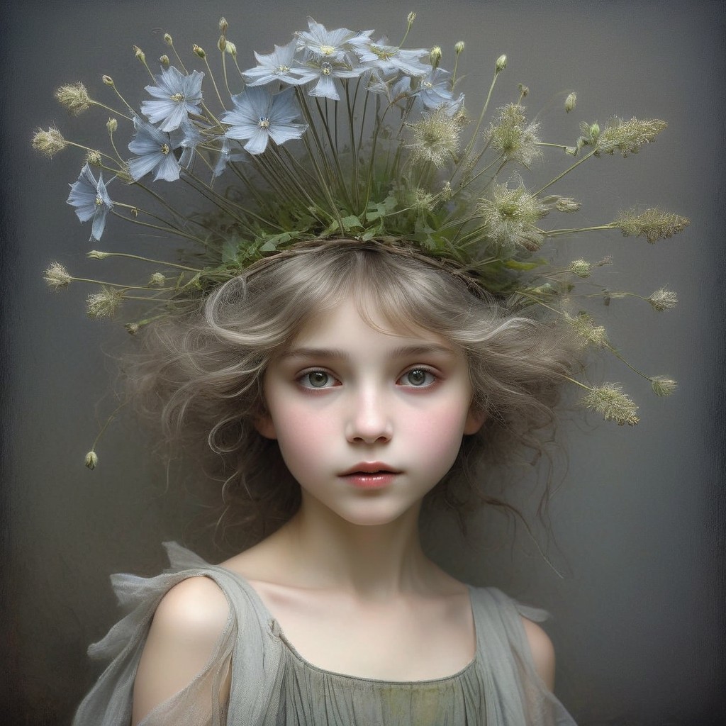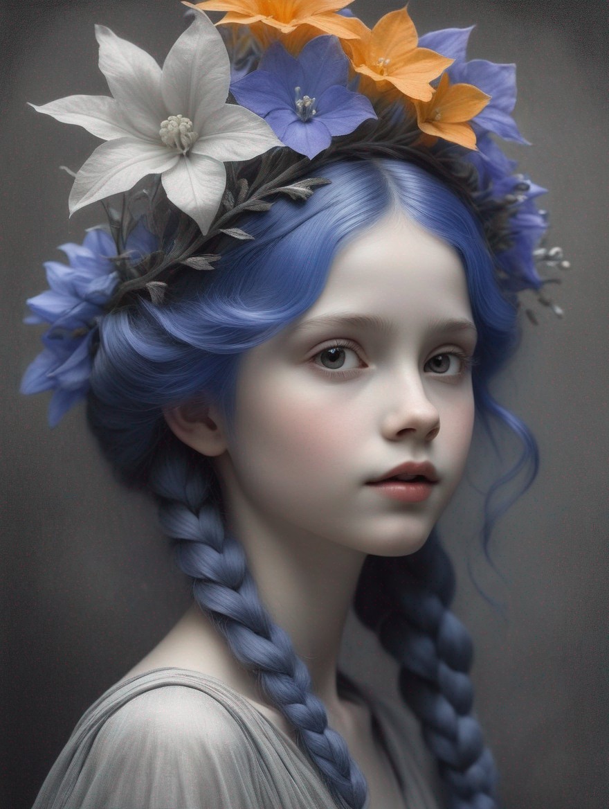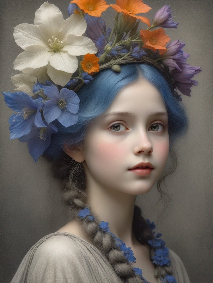 A portrait of a girl with wavy hair, wearing a blue flower crown, with a subtle, dreamy expression, against a grey background.