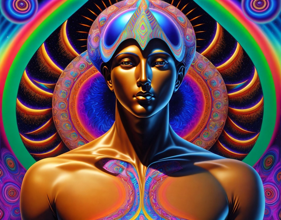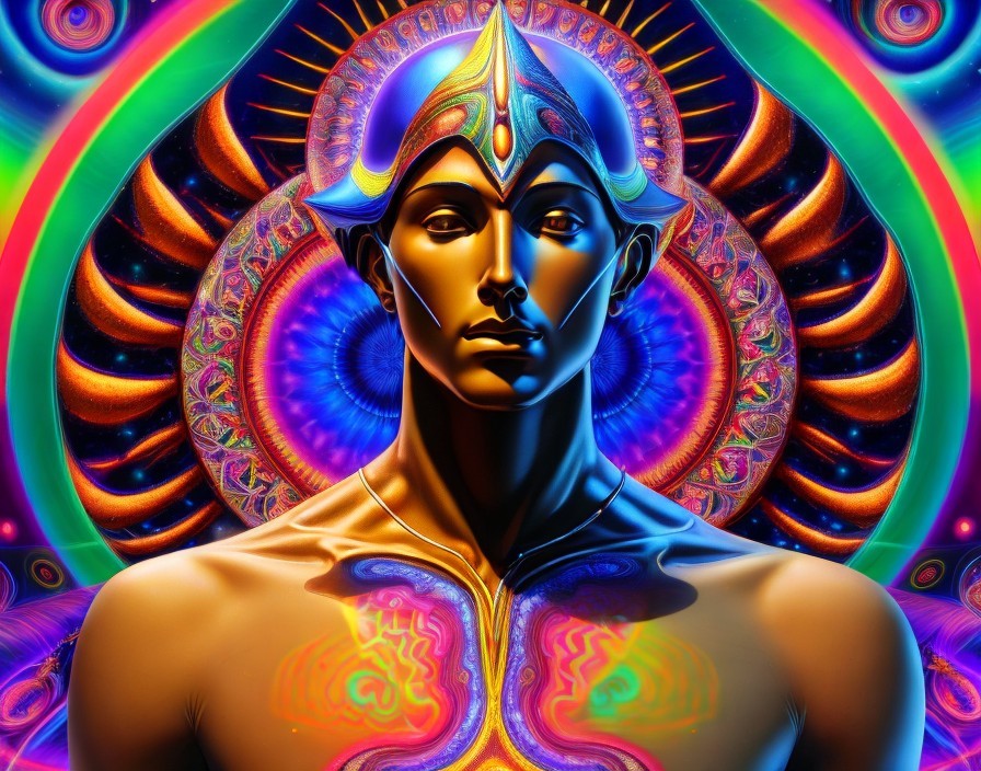 A vibrant, psychedelic artwork depicting a blue-skinned figure with intricate patterns and symbols, surrounded by a colorful, radiant mandala background.