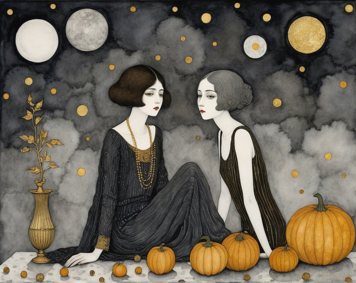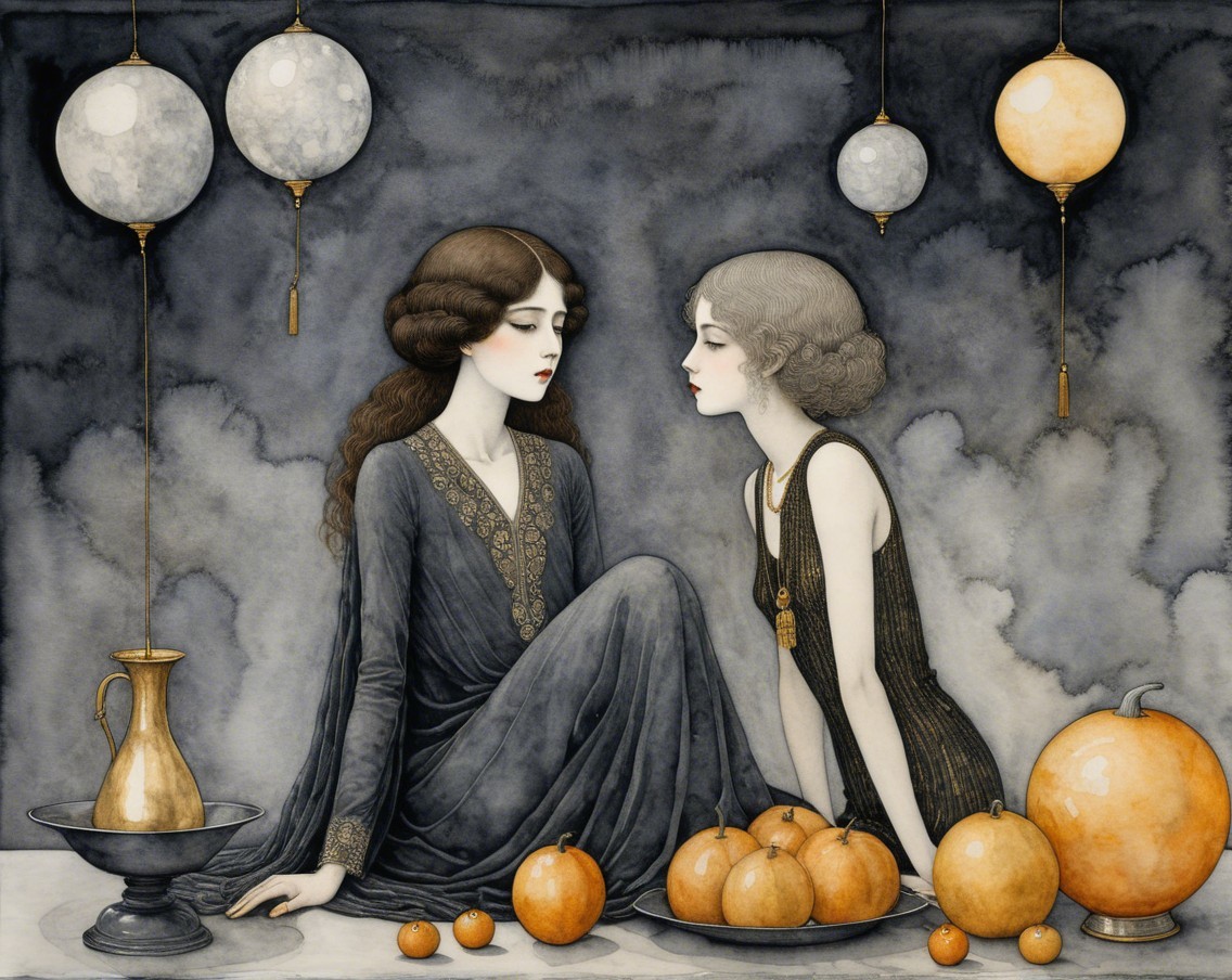 Two elegantly portrayed women in black dresses sit amidst a dreamlike backdrop. Golden orbs and a full moon enhance the mysterious atmosphere, while delicate lines create a timeless elegance.