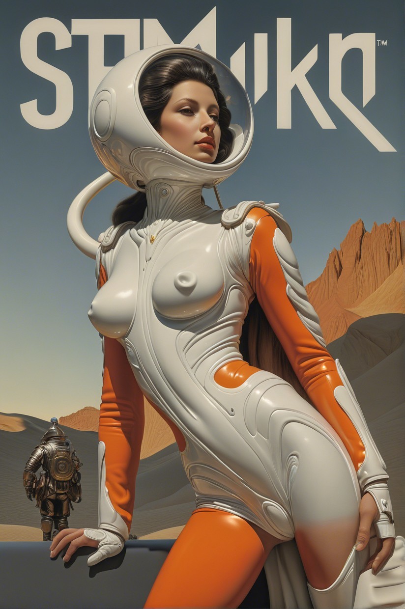A striking retro-futuristic illustration features a woman in an orange and white astronaut suit, posed confidently in a scenic landscape with mountains and a colorful sky. The bold title "SENLUKO" is prominently displayed.