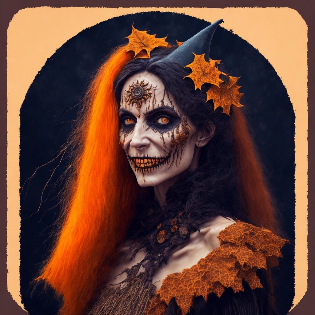 A striking doll with vivid orange hair and intricate face paint. The spooky design features skull motifs and bright eyes, complemented by autumn leaves atop a whimsical hat. Perfect for Halloween!