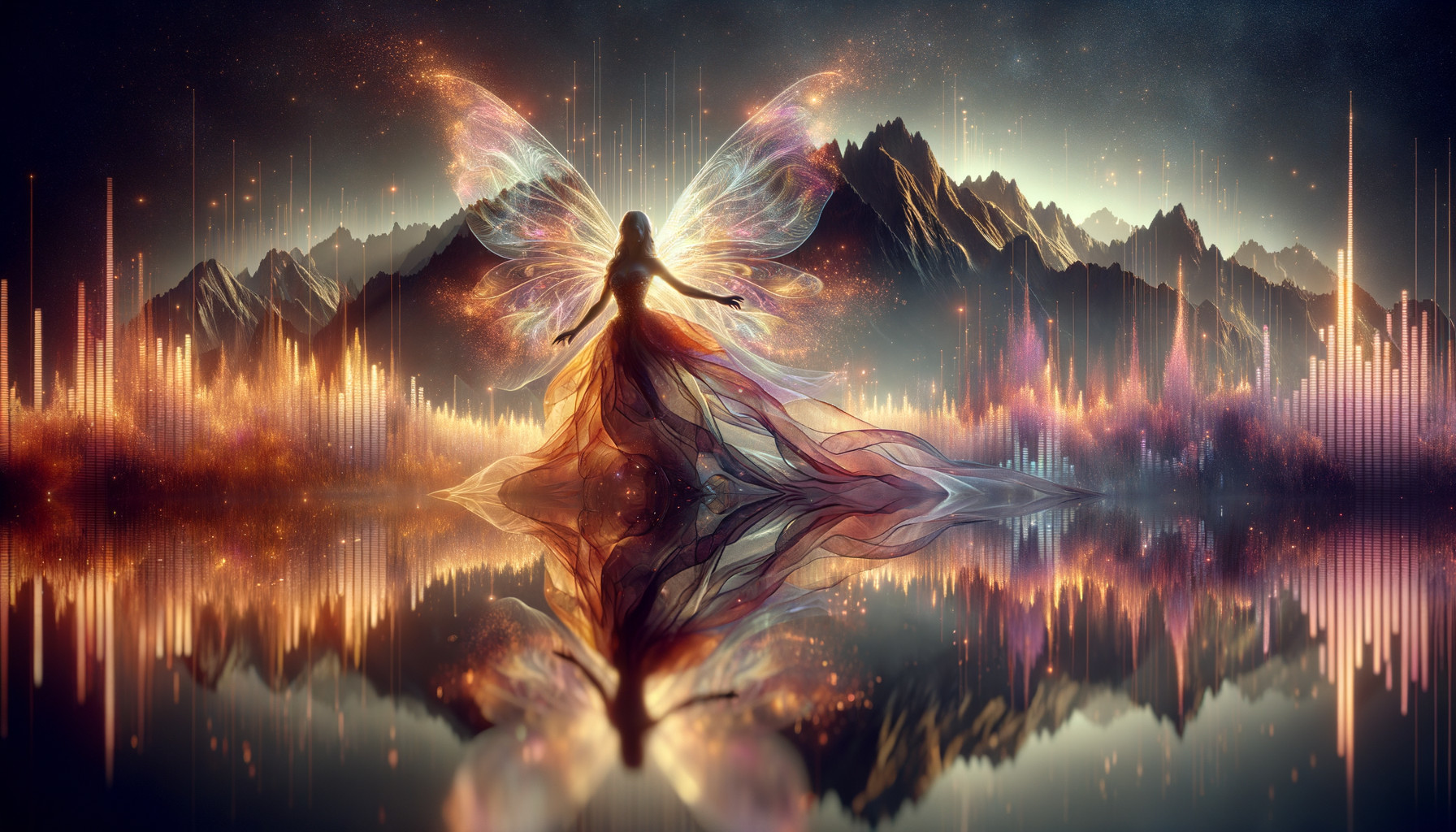 Prompt: "Visualize an image of a detailed, high contrast graphic equalizer of a sound wave. The wave takes the form of a panoramic silhouette of a majestic mountains reflected in a water surface. Overlaid on this image is a double exposure of a of a beautiful fairy dressed in a long shiny satin dress, with glistening semi transparent wings, with her left arm gracefully extended overhead and her right arm stretched out behind, she is listening to relaxing music. The ultramodern image renders itself in a combination of techniques with deep detail. iridescent reflections, flowing textiles of actual nature-mountains topography. Image colors are orange, pink, red, purple shades, lemon, violet, and yellow"