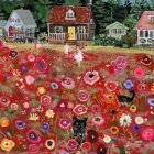 A cheerful girl in a white shirt and pink skirt runs joyfully through a vibrant flower field, surrounded by blooming poppies and quaint houses, with mountains in the background.