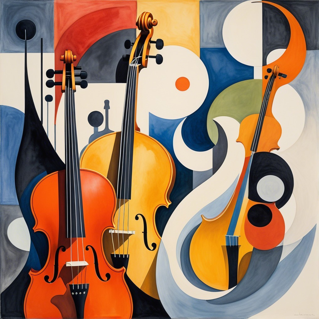 The image features a vibrant abstract composition of three violins in striking colors, surrounded by geometric shapes and fluid forms, creating a lively and musical atmosphere.