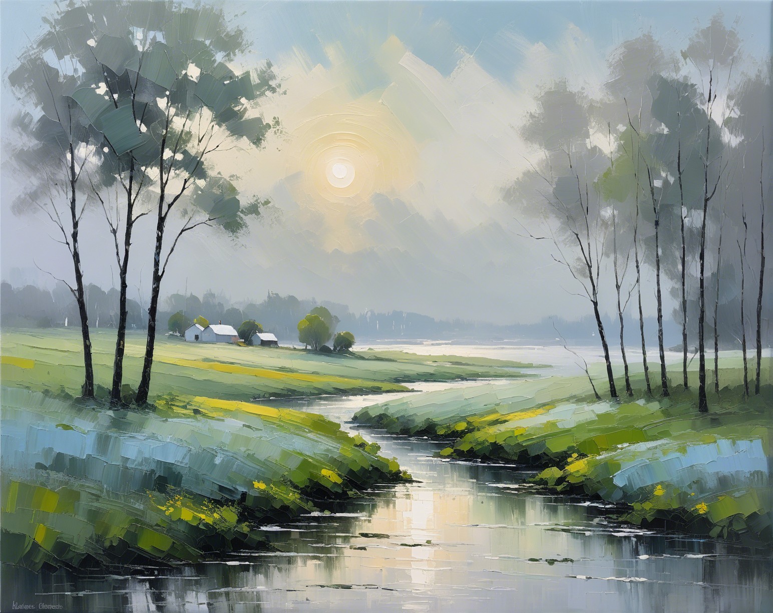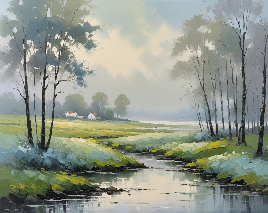 + Prompt:Create an abstract impressionism landscape view of a misty afternoon near the shore, in the outskirts of a small rural village. Use impasto, brush strokes, underpainting, washed tones of grey, white, light blue, light green.