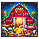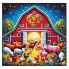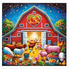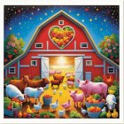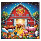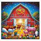 A vibrant farm scene features a red barn with a heart-shaped display of fruits. Farm animals, including cows, pigs, and chickens, surround colorful baskets of fresh produce under a sunny sky.